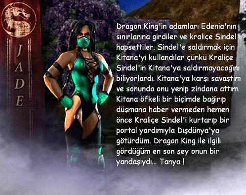 Tanya Kamidogu'nun tamamlanmasını durdurması için Dragon King'e bildiği her şeyi söylemişti. Ama Onaga tüm Realmler'i ele geçirmeden önce Jade Tanya'nın ölümünü görecekti. Jade Tanya'yı yakalamaları için Baraka'nın askerleri Tarkatan savaşçılarını gönderdi ve Tarkatanlara yenilmiş rolü yaptı. Tanya yakaladığını düşündüğü Jade'ye yaklaşırken, Jade tam o an için bekledi...